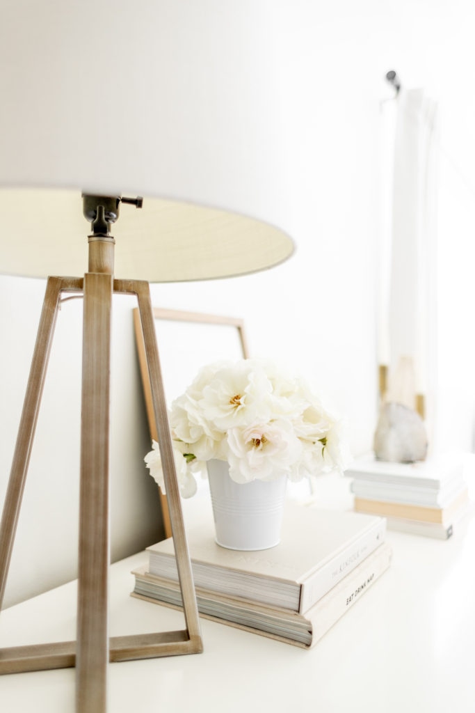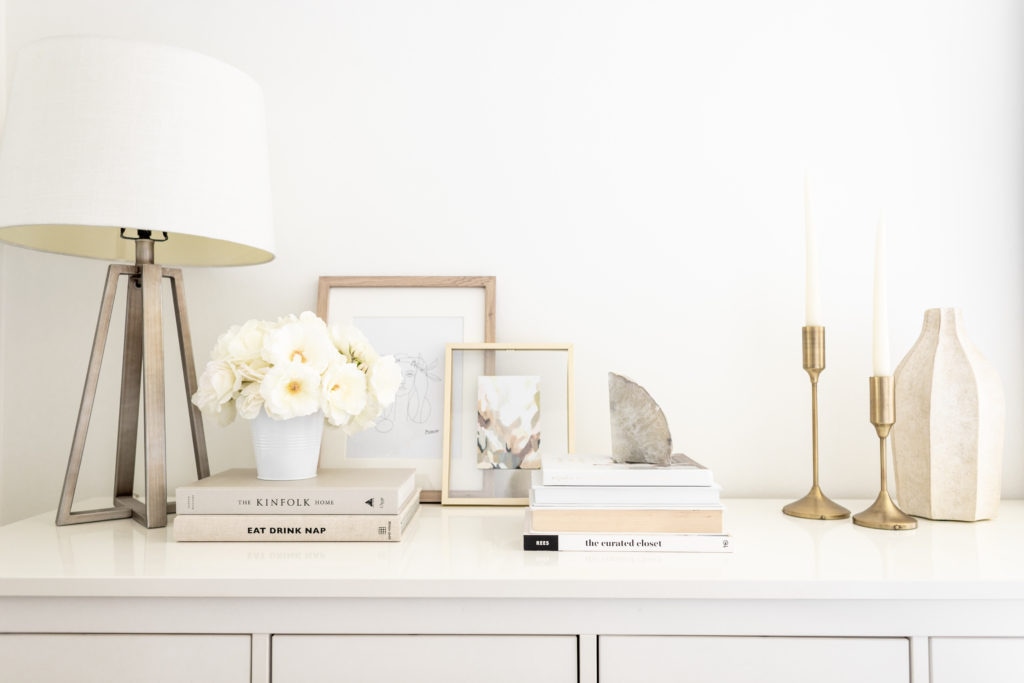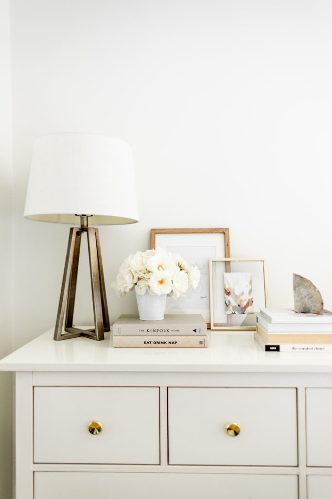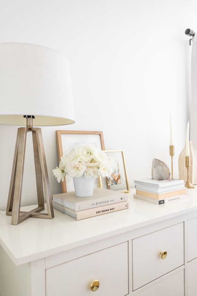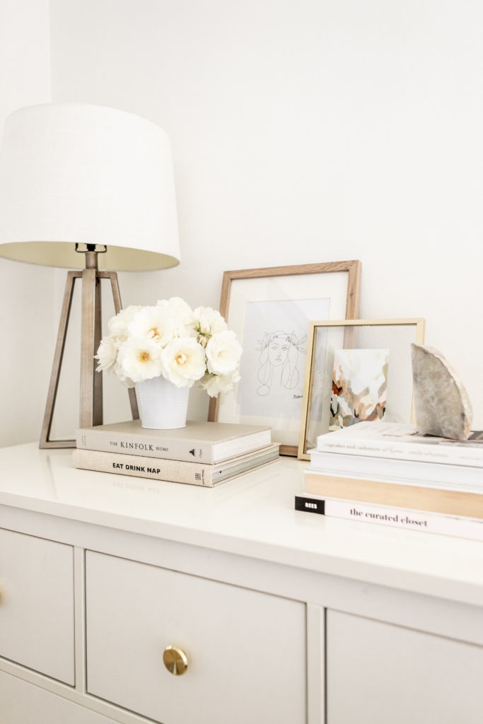 I would say my main tip for styling a dresser is to create layers in sections. You can see that I have small groupings of items going across the dresser, ranging from small to tall objects! I started with my lamp, then added the artwork, vases, candles, books and flower arrangement. All of it works together to create a cohesive look! I may even go a bit bigger with the artwork eventually, but like I said earlier I just styled it today with what I had on hand!