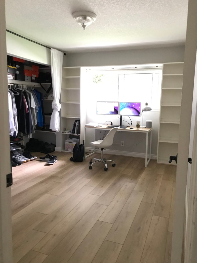 If you’ve followed my blog for a while you know I like to design spaces all at one time. Our office has been pretty much bare for the past four years and I’m so excited we are finally going to renovate it! Currently, Jordan’s clothes and a desk are about all we have in here. The clothes will be moving out and lots of pretty furniture and decor will be moving in! Here’s what the office currently looks like.