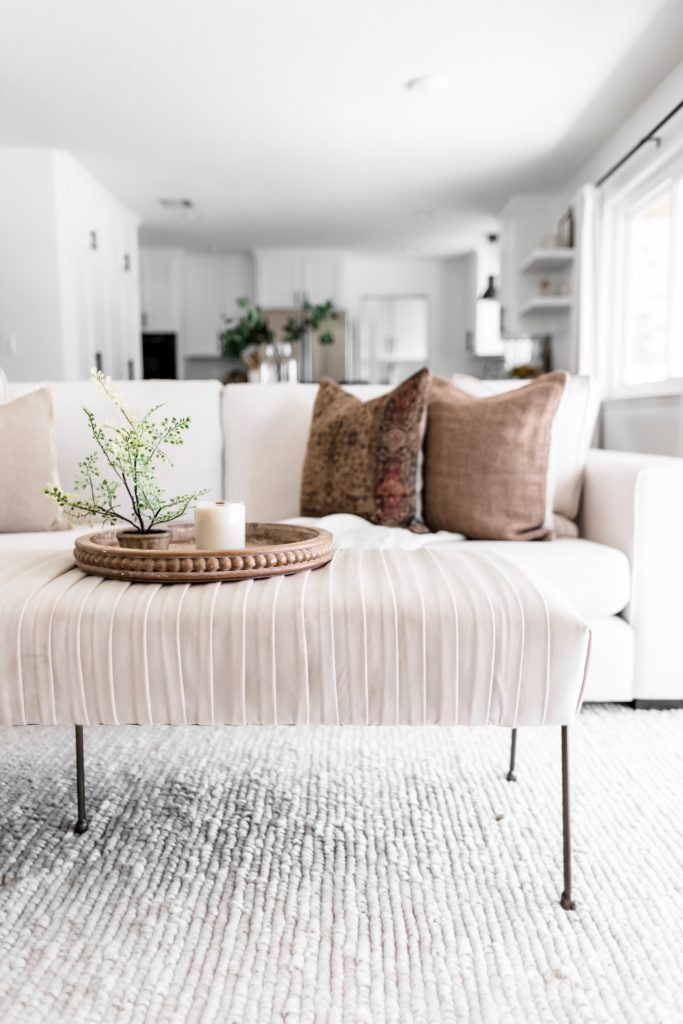 When I decided to move our old coffee table outside I started looking for a replacement table for our family room. Originally I was looking at various coffee table options, but when I came across an image by Amber Interiors that featured an upholstered bench I quickly changed my mind! Suddenly I started being drawn to upholstered bench options and found so many beautiful ones.