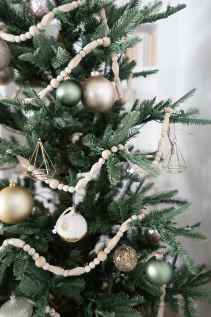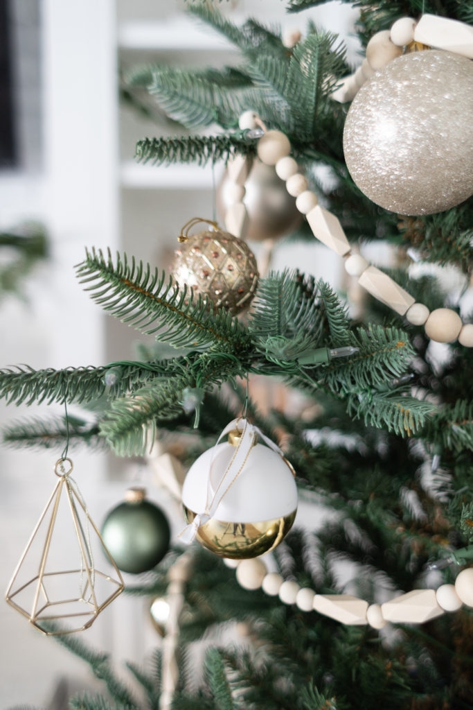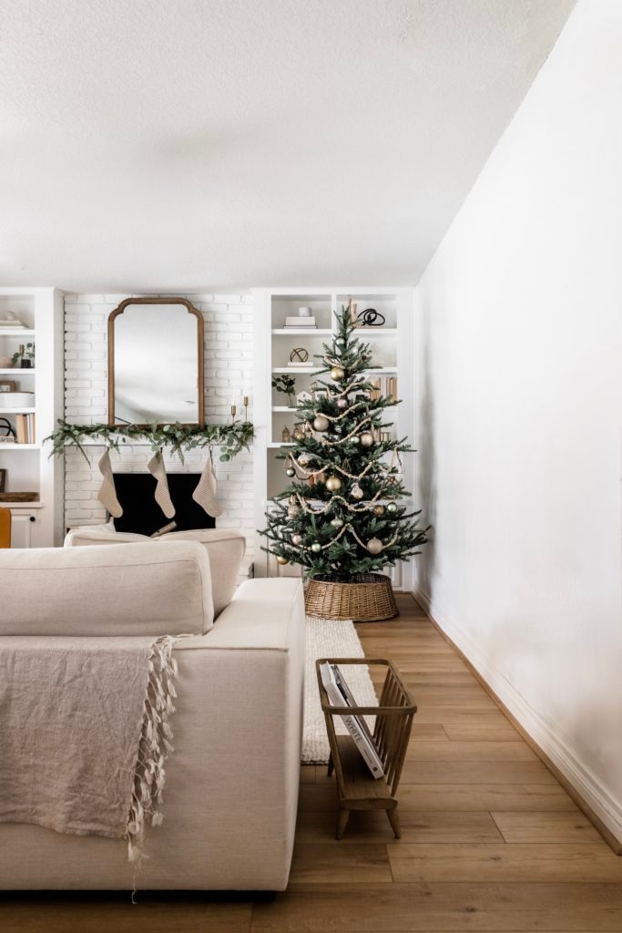 Our tree is adorned with natural wood garland and ornaments this year. I kept it simple with pretty golds and white, adding in pops of green and blush to create interest and contrast. Our tree collar is available at a few different stores so I’ll link it for you below!