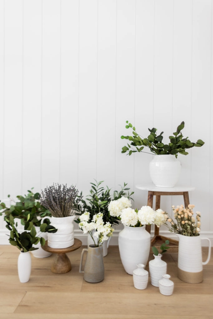 - Select a variety of greenery and florals. Keep things fun and interesting by styling greenery with seasonal stems and flowers. I love mixing in dried florals too!