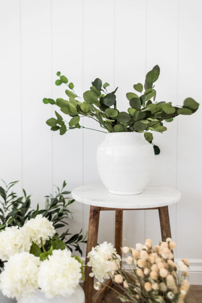 It’s no secret I’m a huge fan of fresh eucalyptus. I often use it in our main living areas and love the way it softens my designs by adding a bit of neutral color. One of my best design tips, though, is to use a mix of fresh and faux botanicals throughout your home. It’s a reasonable and cost effective way to keep every room in your home styled like a pro.