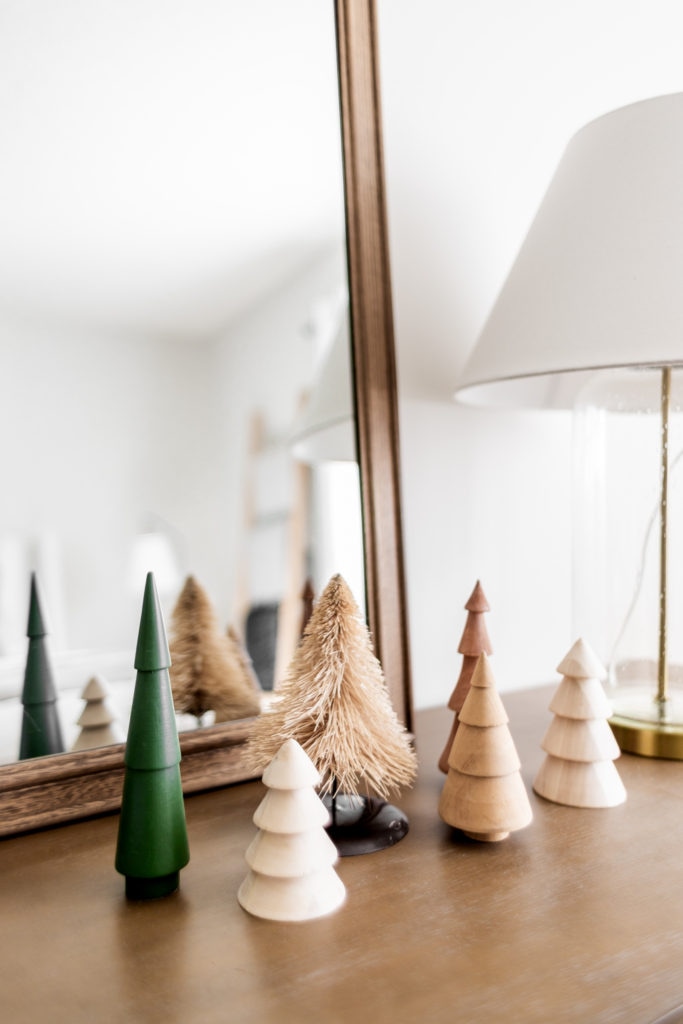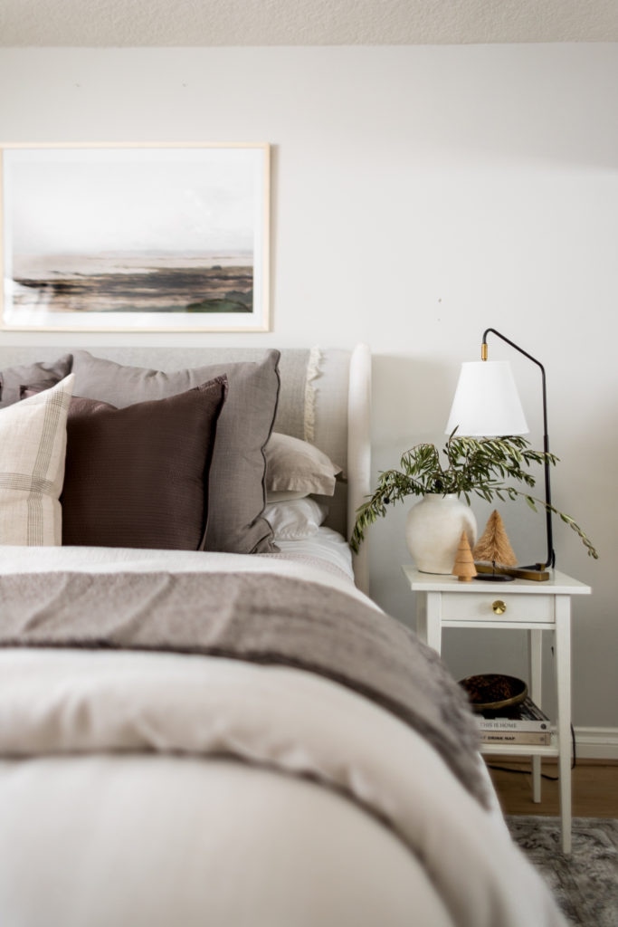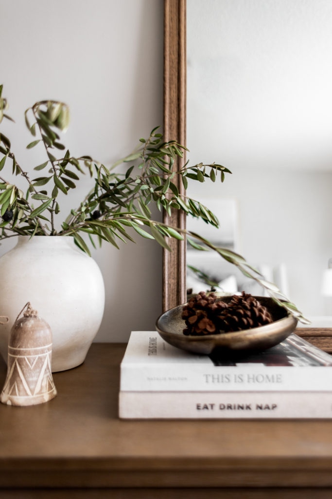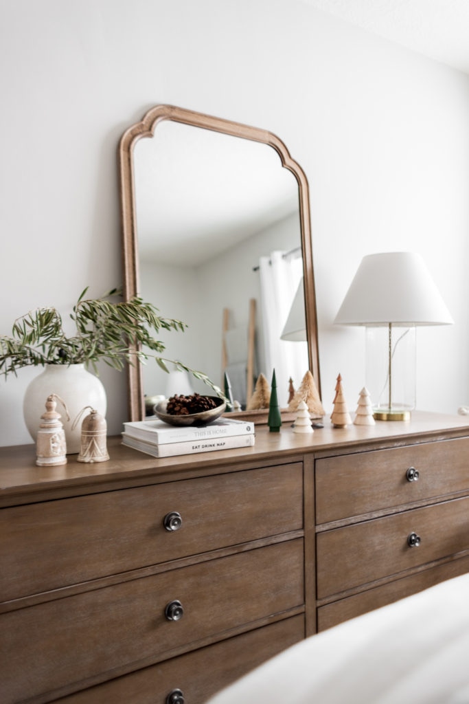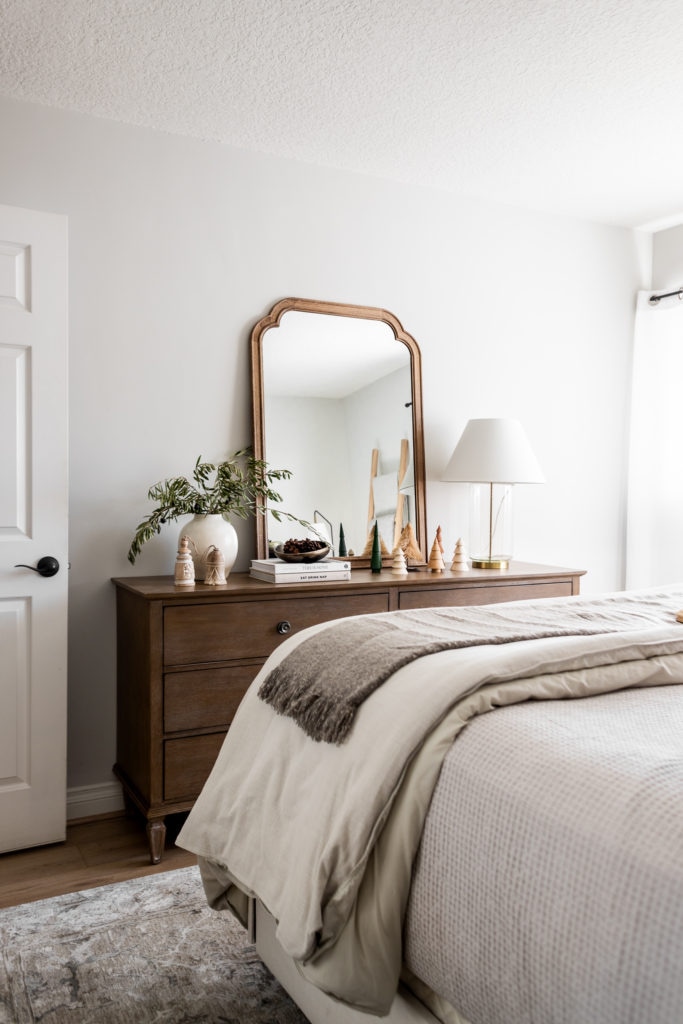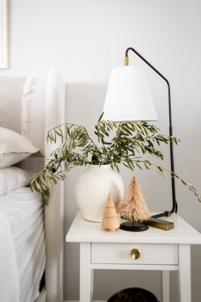 To create a festive look in our guest bedroom I added lots of cozy layers on the bed, even styling a throw blanket on the headboard! Such a fun and easy way to give depth and dimension to your bed frame. I also added a few decorative accents like the mini Christmas trees, pinecones, olive stems, and a set of bells. All some of my very favorite festive accents!