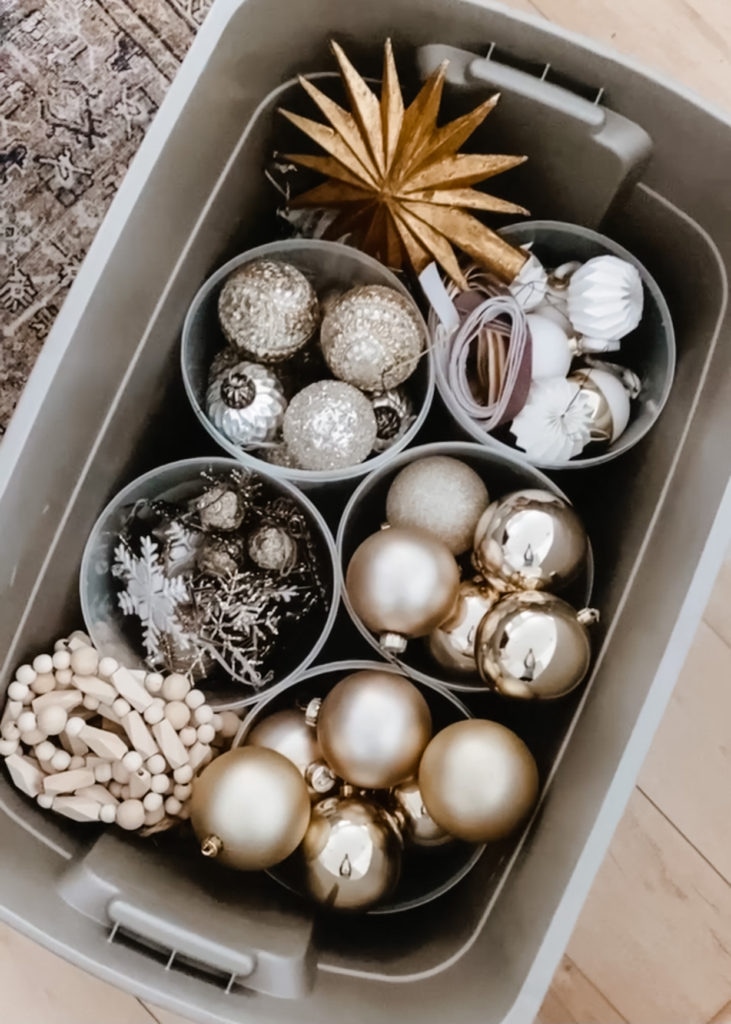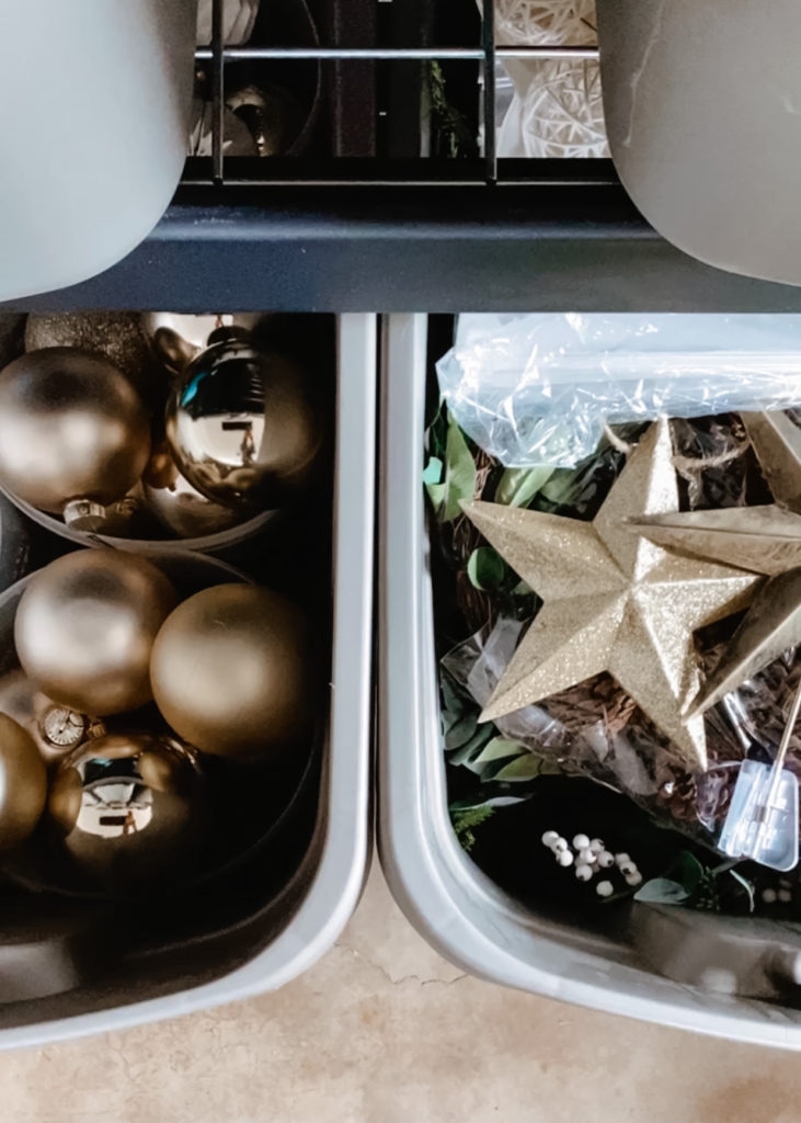 We purchased two metal racks for our garage and store all our excess items, including Christmas decor, in plastic tubs that we organize on the racks. I dedicate four of the bins to my Christmas decor! Having a dedicated space for your Christmas decor makes putting it away quick and easy. I think it only took me about 30 minutes to take it all down and store it! Target, Walmart, The Container Store, and Home Depot are great places to find storage bins. I got my small round ornament bins from the 99 Cent store so make sure to check there and see if they have any in stock!