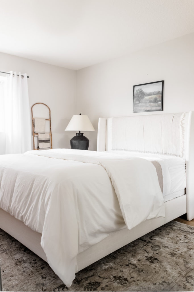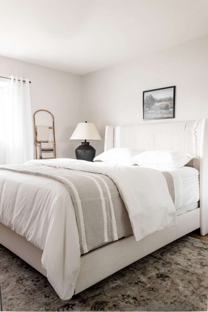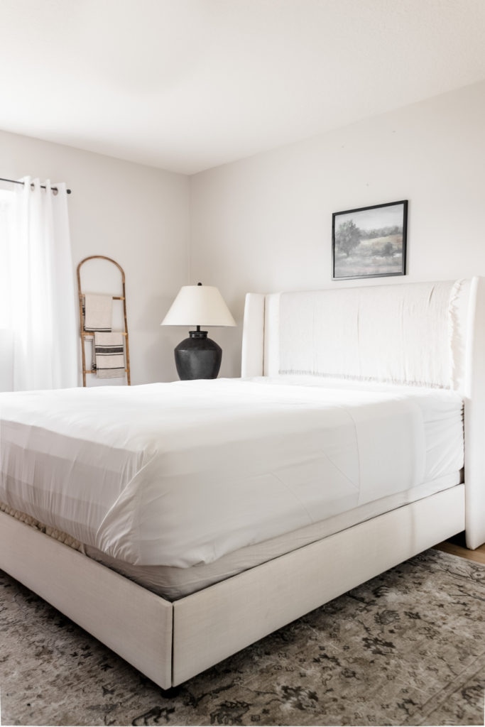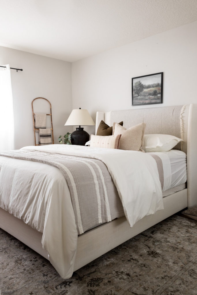 Styling Tip: Think of your bed like it’s divided into thirds. The sheets and blanket are layered on the first third, the duvet is on the second third, and the quilt is on the final third. This gives the bed dimension and contrast!
