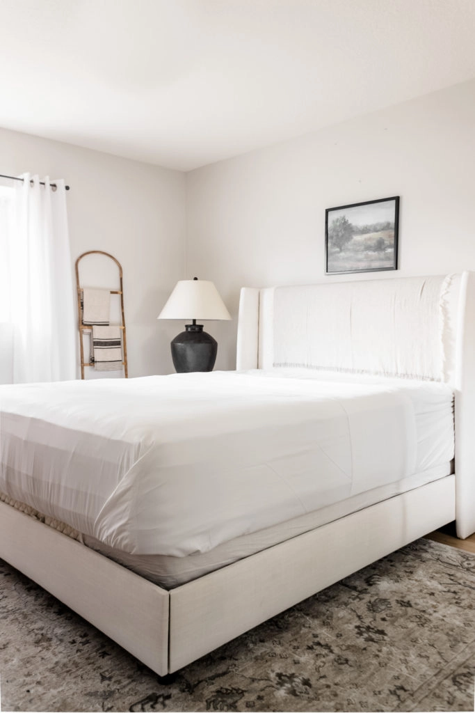 Styling Tip: Place the duvet and insert on top of the quilt. While the sheets and bed blanket will be folded down one-third of the way, fold the duvet down a little farther to about two-thirds of the way down the bed. I’ve tried both the Relaxed Linen Duvet Cover and Egyptian Cotton Sateen Duvet Cover and was so impressed with both! Opt for the Linen duvet if you like more of a relaxed, organic look, and the sateen duvet if you like things classic and clean!