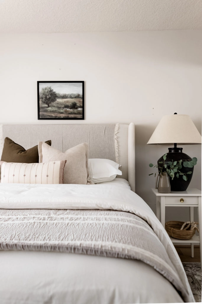 Styling Tip: Finish off the look by layering pillows and adding accents throughout the room. For this look, I layered 2 20” pillows and one lumbar. As for mixing pillow patterns, one fool-proof way to pair pillows is to use one plan, one textured, and one patterned pillow cover. This will allow them to work together to create a curated look without clashing! Stop by The Company Store for a wide variety of throw pillows and decorative accents.
