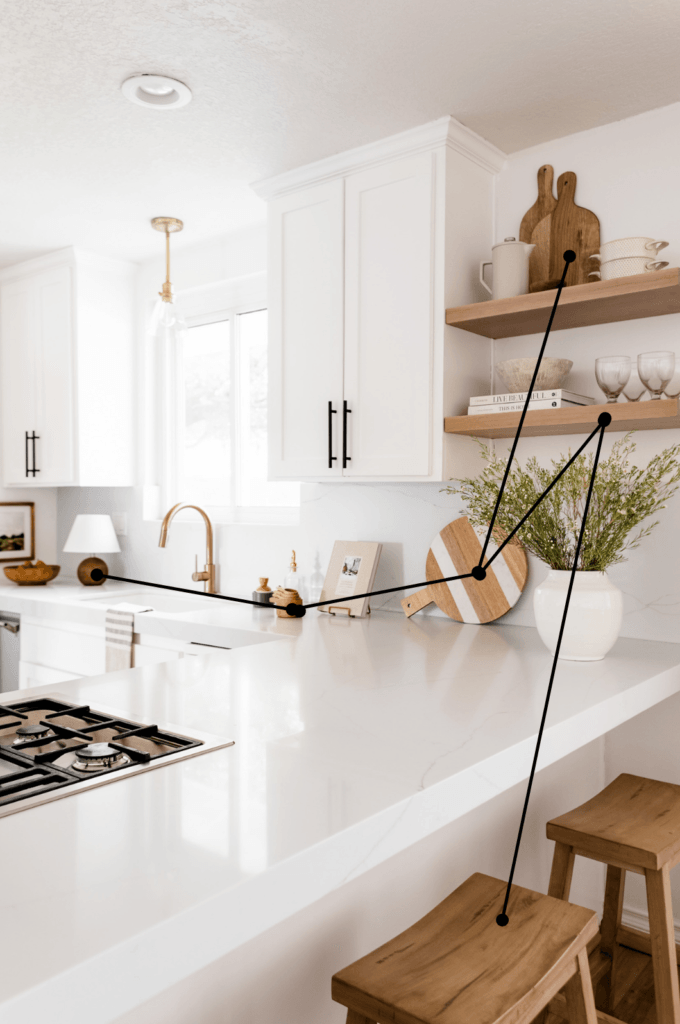 I have this weird analogy I made up in my head when it comes to wood tones, or any tone for that matter, that you’re incorporating into a room. I call it the pinball analogy! When I’m designing a space, it helps to imagine a pinball going through the room. I make sure that the pinball can bounce off multiple places with the same tone. Here is an example for you! Notice how many points have the same tone throughout this space? You want to aim for at least three points to make the room flow together!