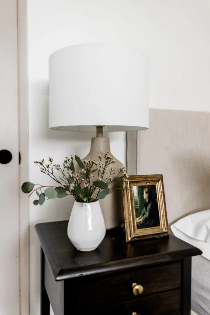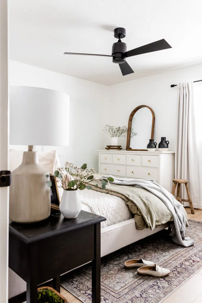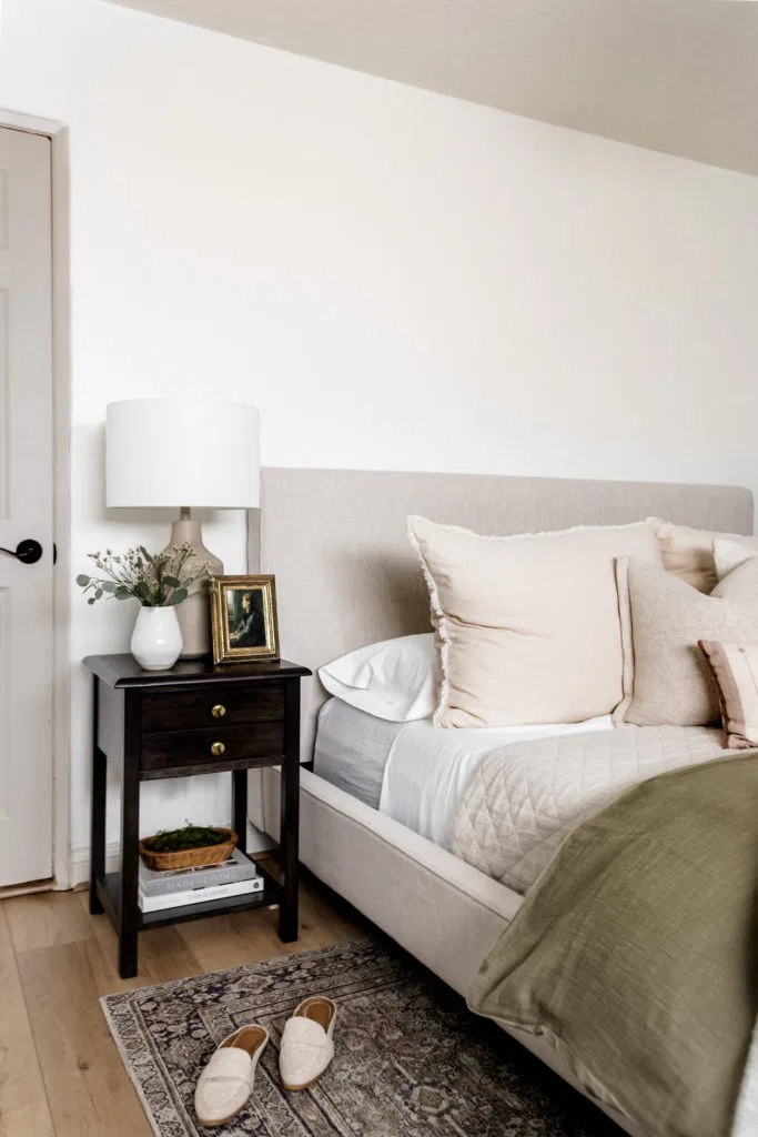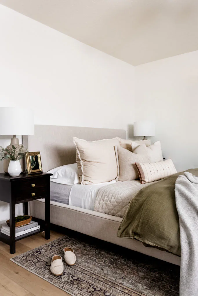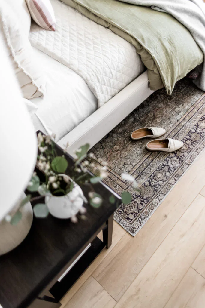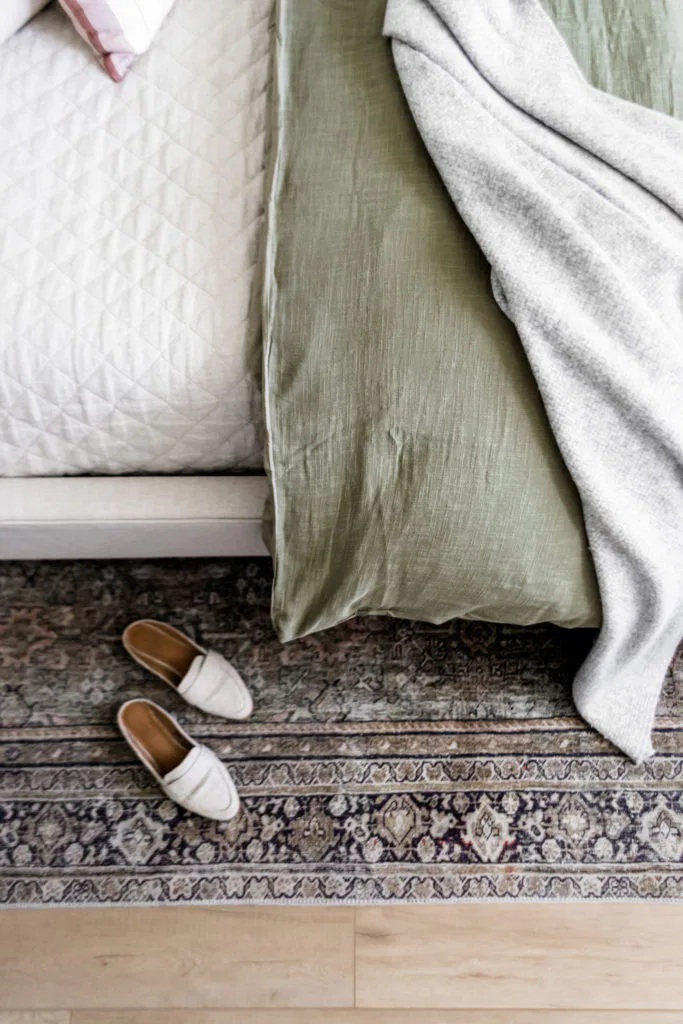 I’ve wanted to create a bedroom design with this rug for such a long time. The colors and contrast look so gorgeous with wood, metal, and upholstery, so it could work with just about any bed frame. I also wanted to create an olive green bedding look, so I decided I would tackle both projects at once!
