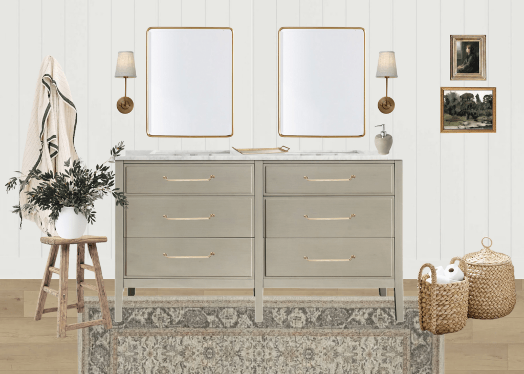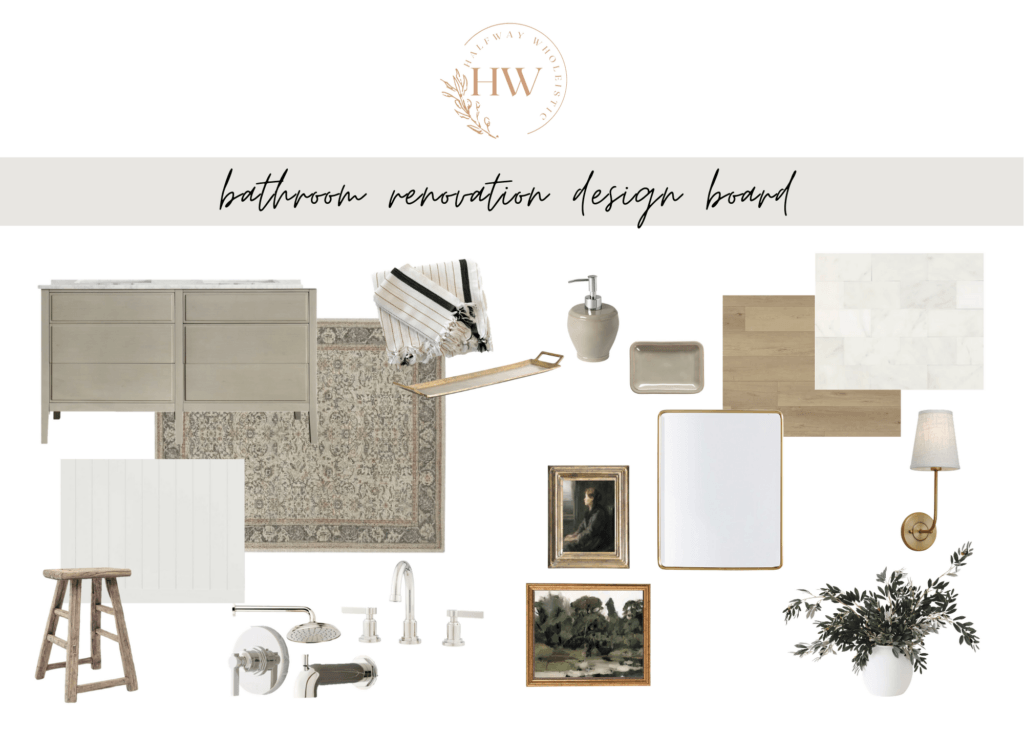 Here’s the design for the bathroom renovation. We decided to keep our vinyl flooring here (see this post for all flooring details) so I built the design around that! Overall I wanted it to be neutral but have contrast and character. The only thing you don’t see on the design board is the tub! We’re adding a nice alcove soaking tub that I plan to pair with a gorgeous extra long curtain to make it feel more modern.