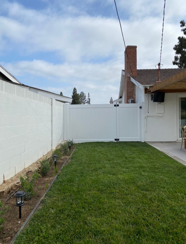 Specifically, we added a new concrete walkway to the front door, added new plants to all three planters, installed three new vinyl gates, and put some shutters on the front window! My final touch was some solar lighting in the planters and trees. It looks so pretty at night! 🙂