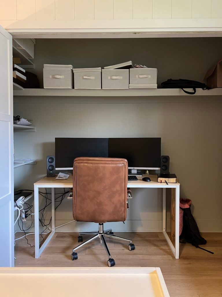 It actually works out really nicely because I’m able to hide Jordan‘s monitors and cords in the closet. Praise. Haha! You’ll notice those aren’t featured in my reveal design 😉