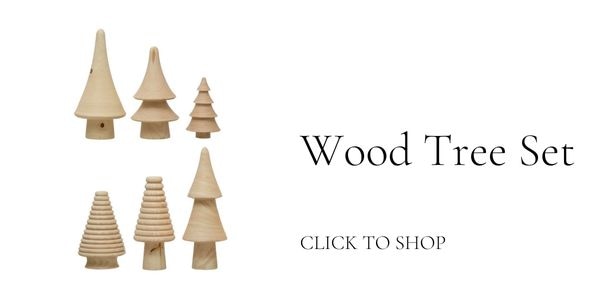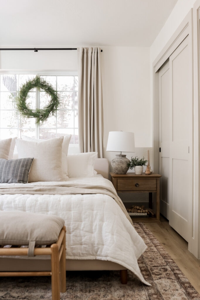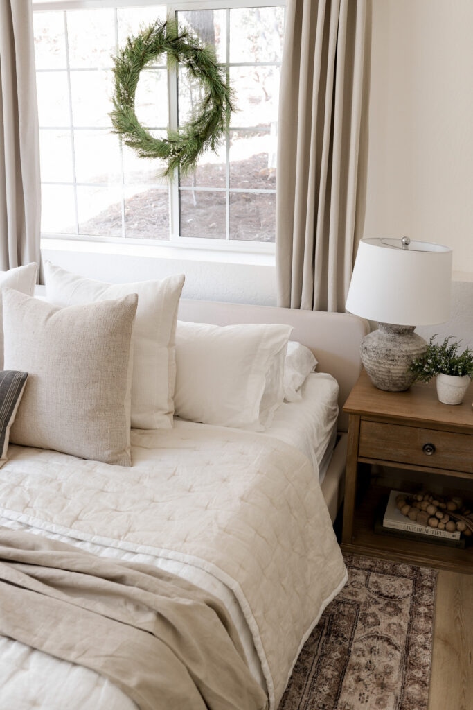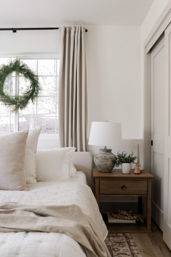 To make this bedroom a little more festive, I just added three simple things: a wreath, seasonal stems, and mini wood trees. That’s it! Looks cute and festive, right?