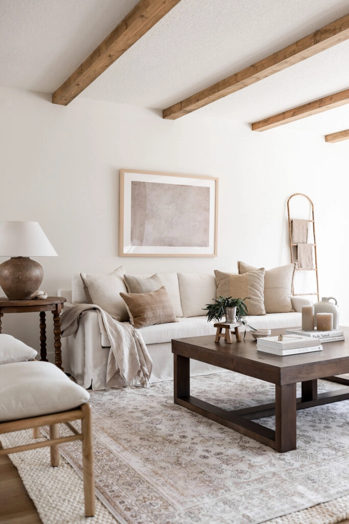 When layering rugs, it’s essential to mix and match different textures, patterns, and materials. This creates a visually appealing look that adds depth and interest to your space. For instance, you can layer a fluffy shag rug on top of a flat-weave rug or a patterned rug on top of a neutral rug. I paired the Off White Handspun Jute 9′ x 12′ Area Rug and Beige Meena Fading Garden Washable 8′ x 10′ Area Rug from Rugs USA to get this look! The washable rugs are such a great option because of their approachable price tag, high quality, and washability.
