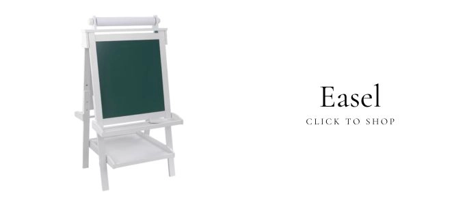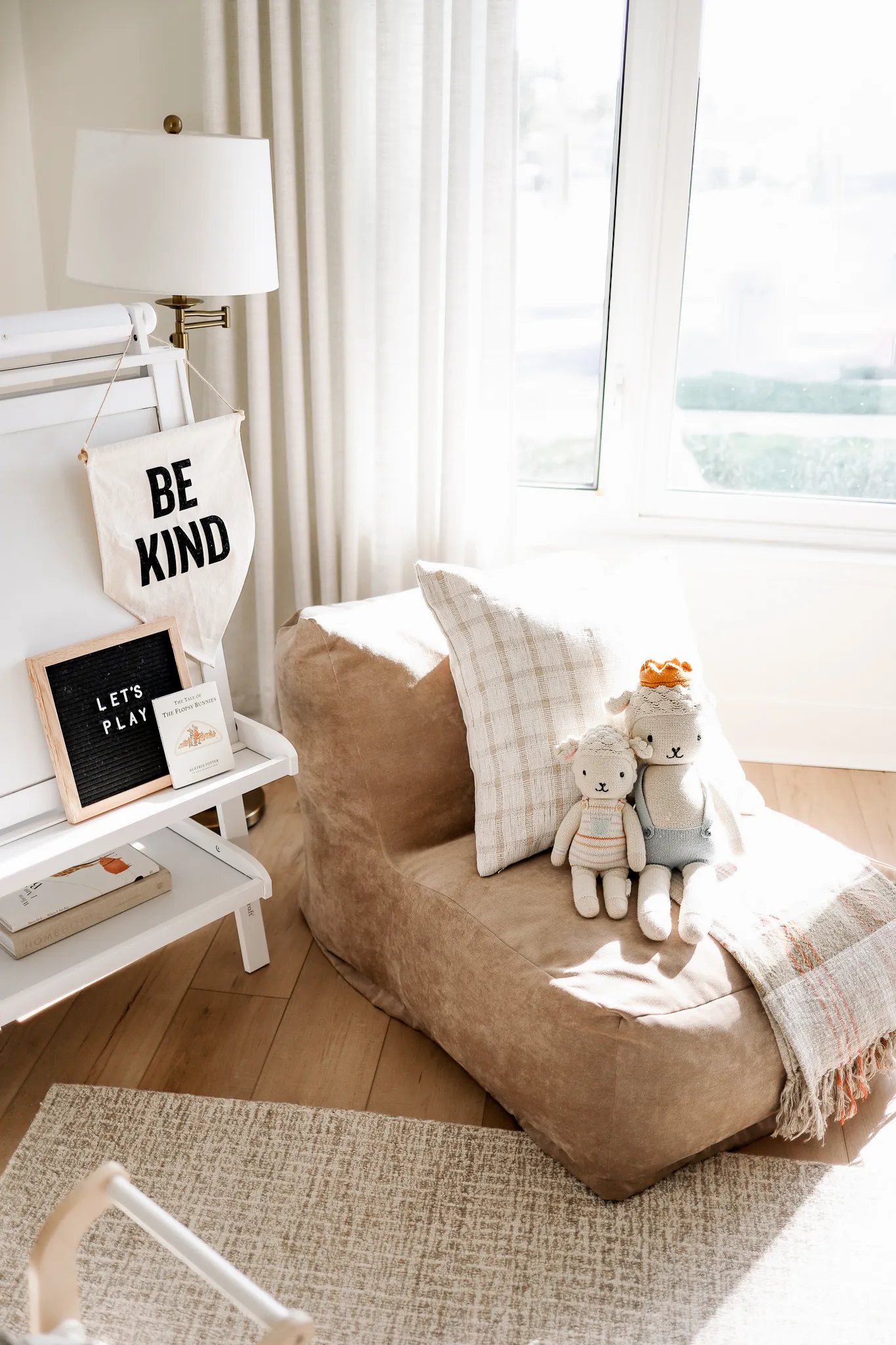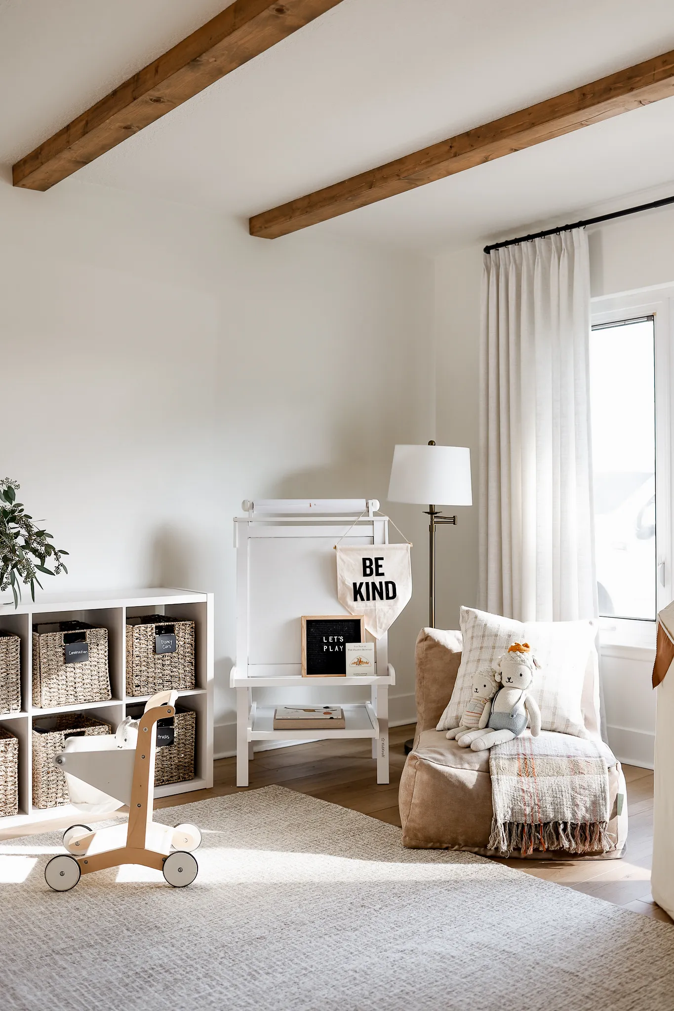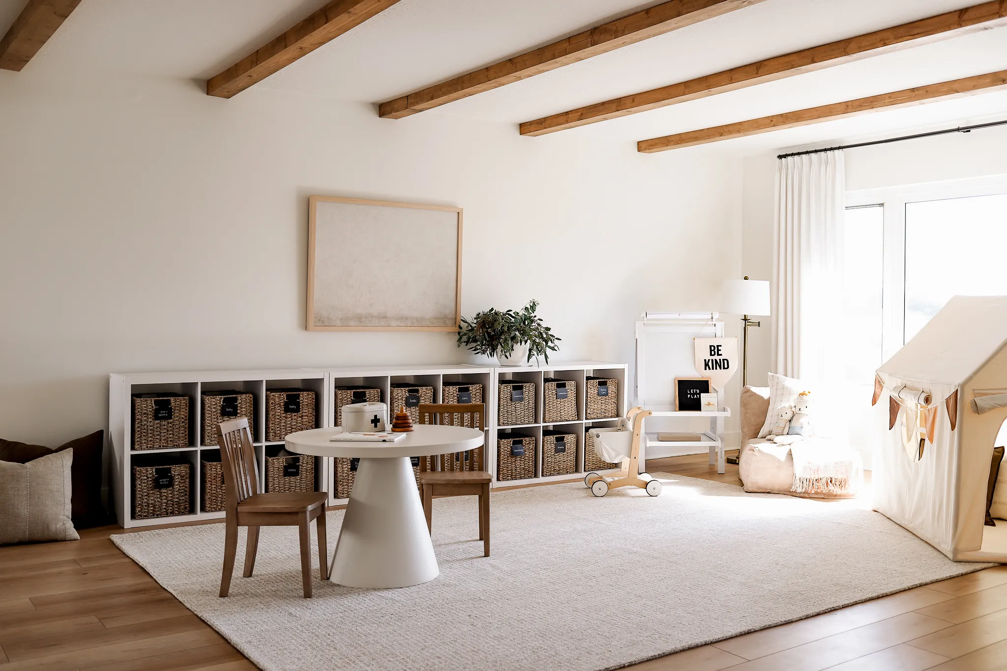 art / cabinet / baskets / basket labels / table / chairs / rug / shopping cart / easel / lamp / lounger / tent / brown pennant banner / curtains / curtain rod / be kind flag / cuddle and kind doll / blanket / plaid pillow
