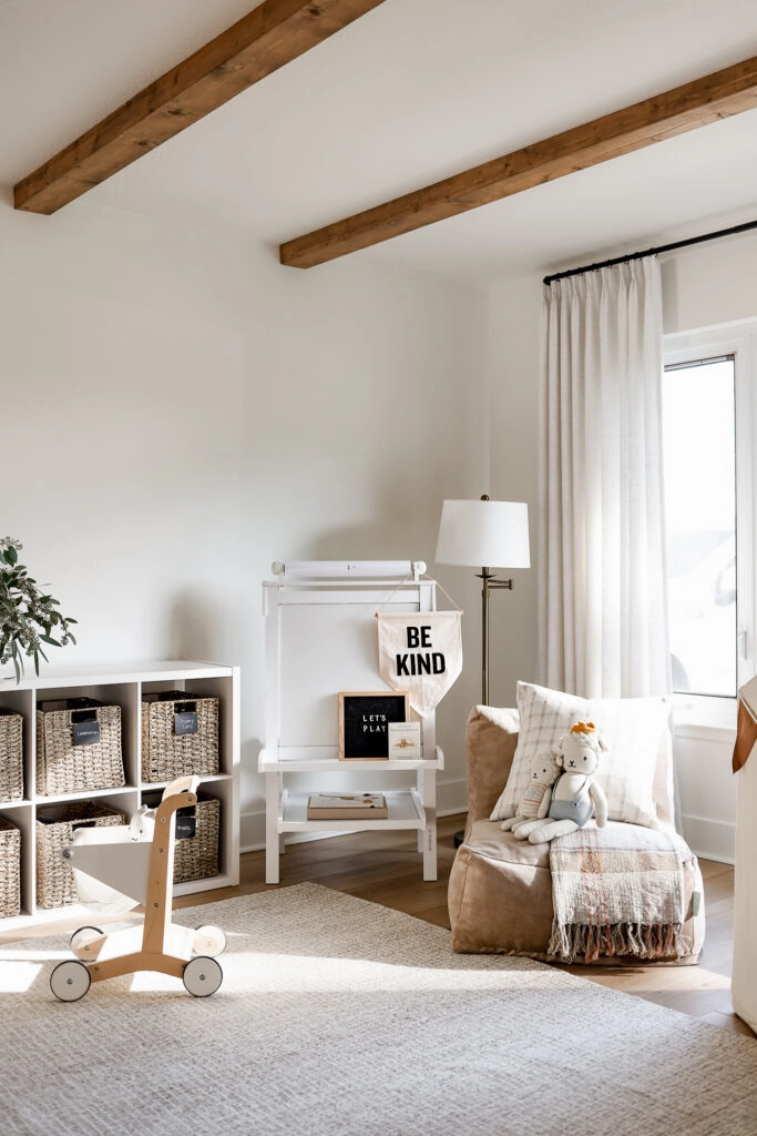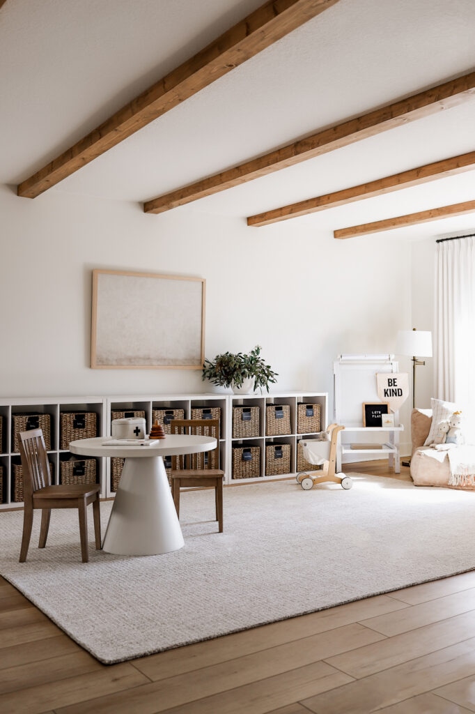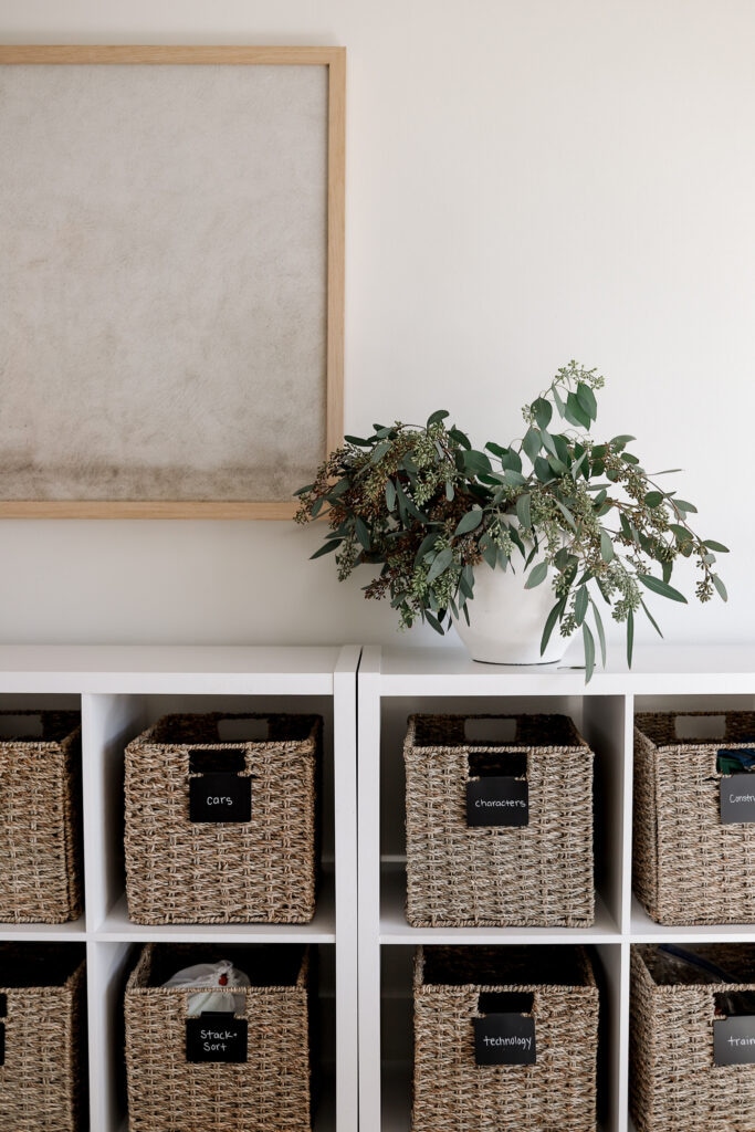 When designing this space, I wanted it to feel like an extension of our home rather than a separate entity or kid space. To achieve this, I opted for neutral, minimalistic furniture and a sophisticated toy storage solution. These cabinets and baskets are perfect for holding the boys’ toys and they also look chic and organized!