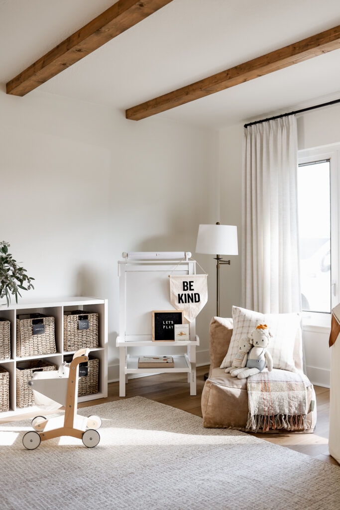 We LOVE how it all came together. Everything from the comfortable wool rug, storage bins, play table and chairs, easel, kids lounger, and canvas play tent have been the perfect additions to the space. Not only are they aesthetic, but they set a foundation for play, exploration, and family bonding. We spend so much time in here each day and my only regret is not doing it sooner! If you’ve been on the fence about turning an unused space in your home into a functional living area for your family, I say go for it! 🙂