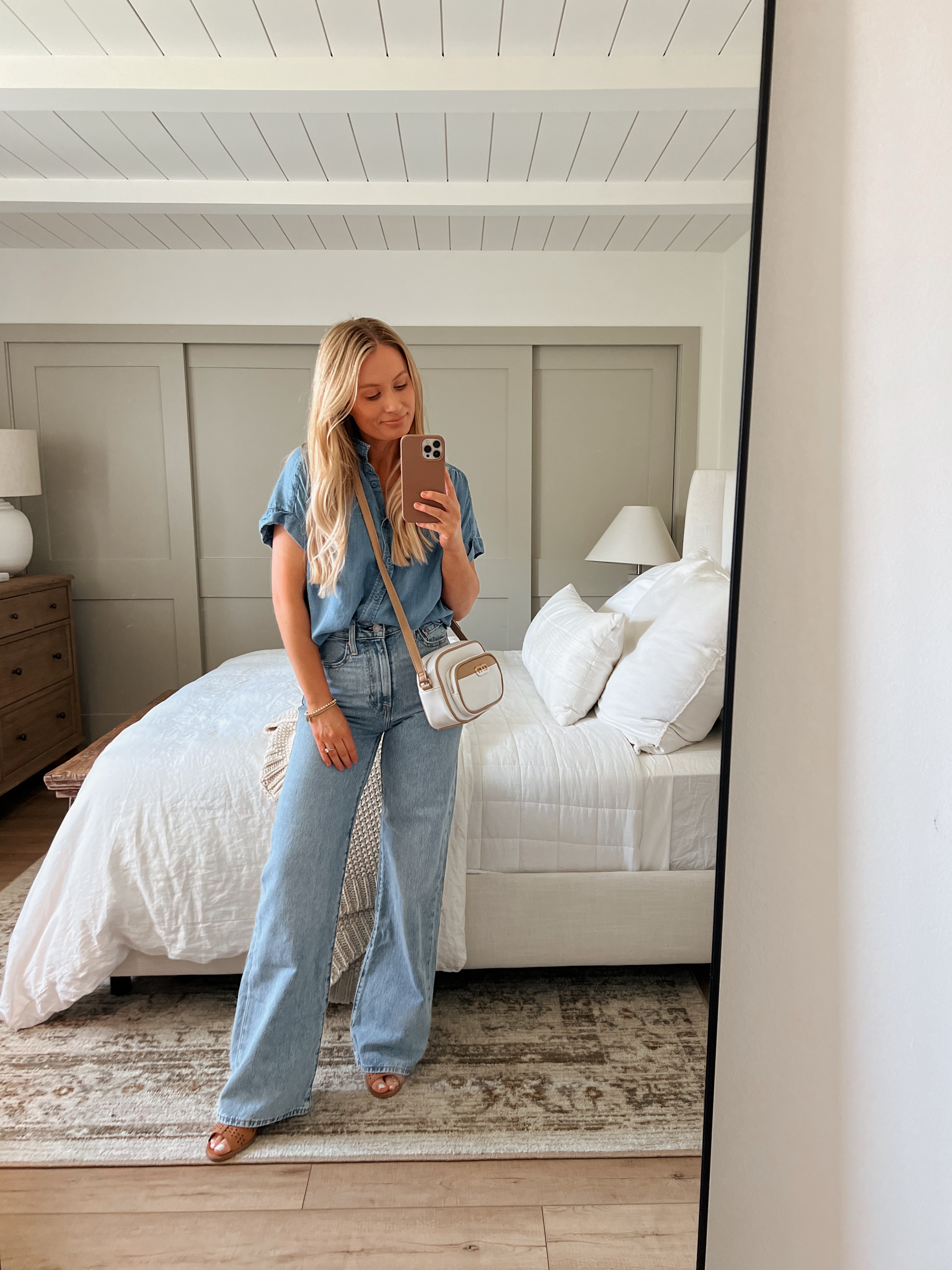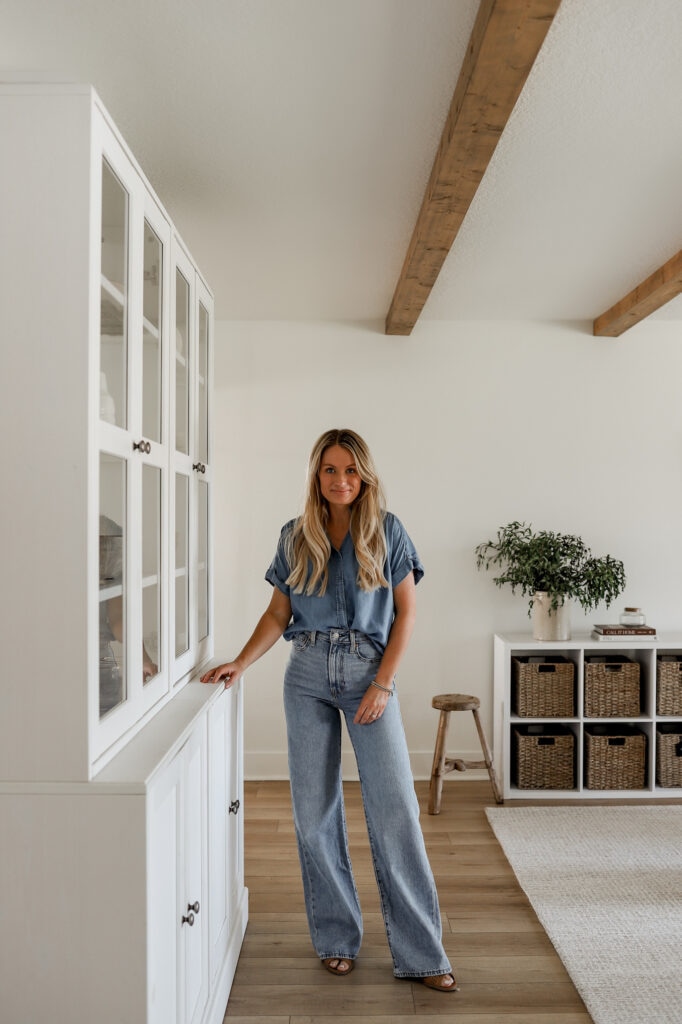 For a classic, timeless look, combine a chambray shirt with my favorite ribcage denim pants. The chambray shirt is lightweight and breathable, perfect for warm weather. Ribcage denim pants offer a high-rise fit that is both comfortable and trendy. This outfit is perfect for those who prefer a more traditional denim look while still keeping it stylish and appropriate for the holiday.