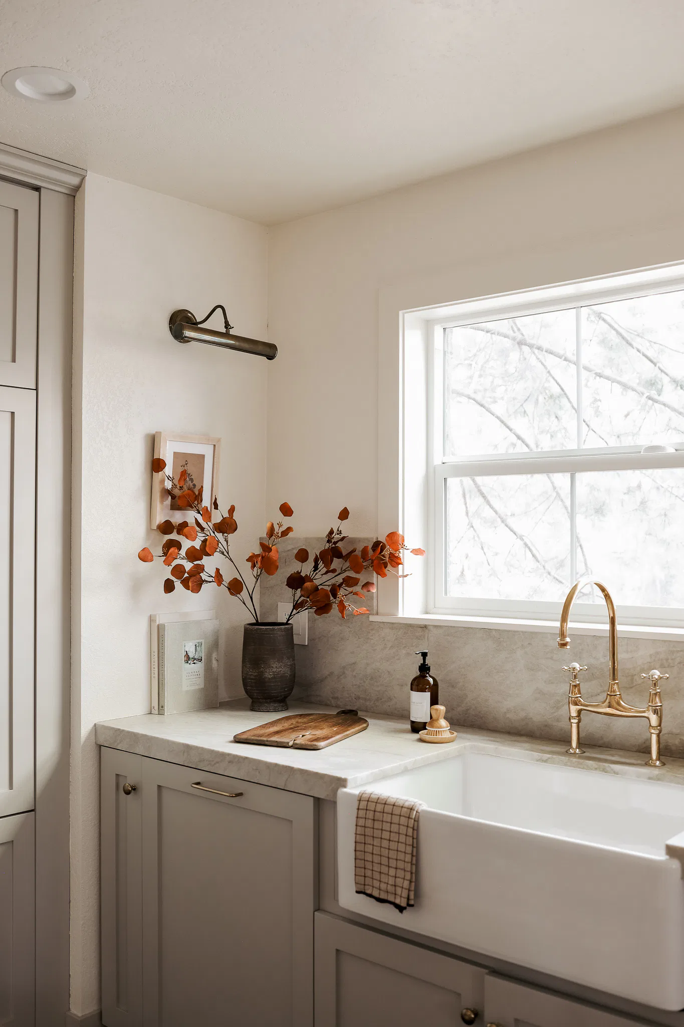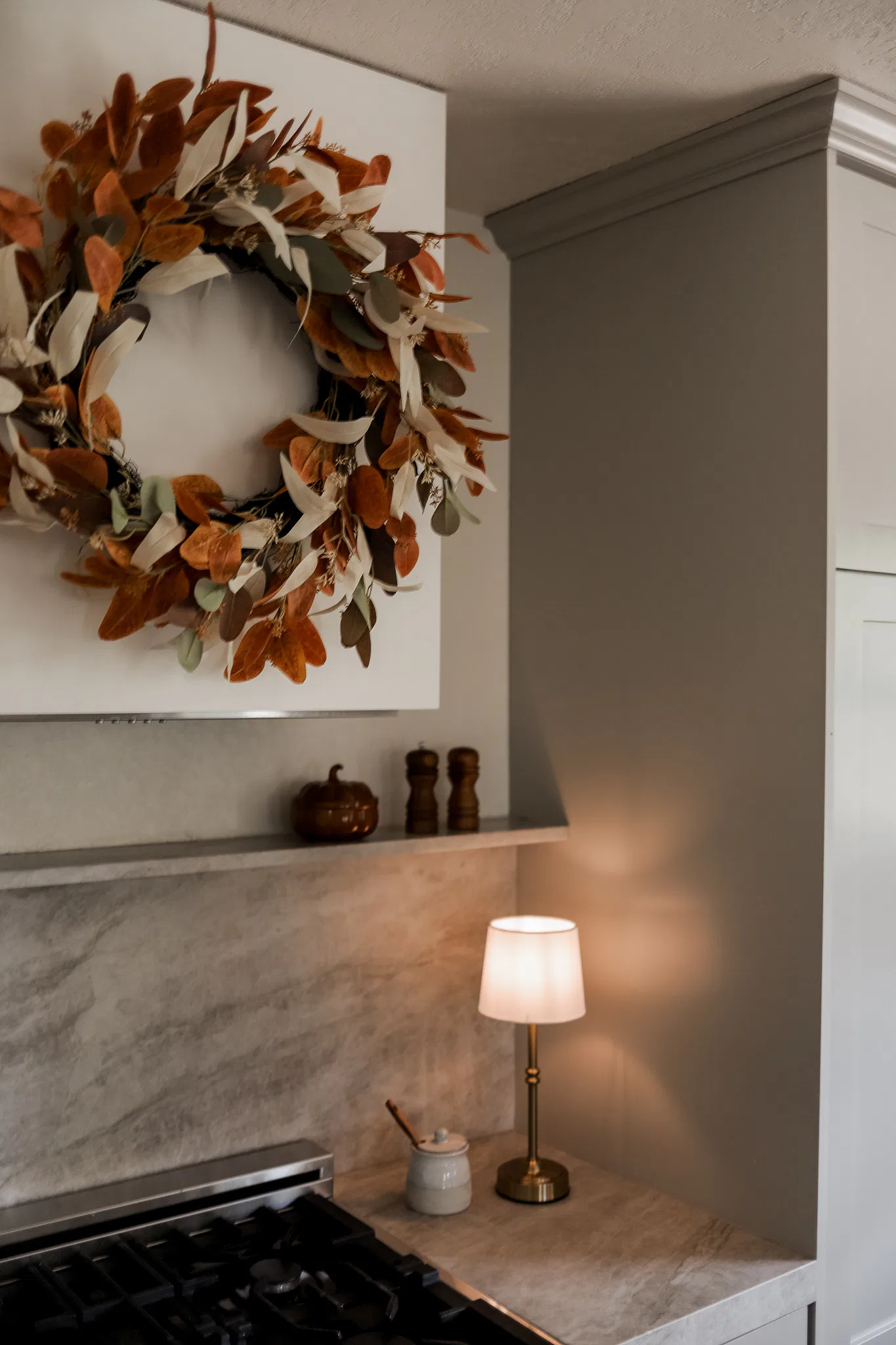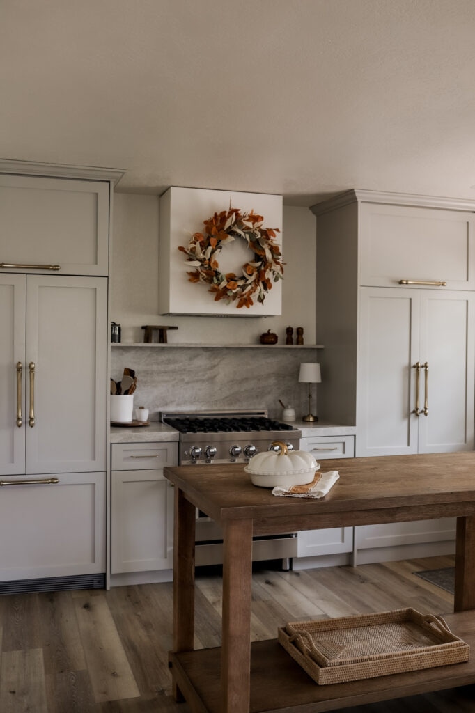 Next to that, I’ve got a wood cutting board on display with these stunning fall stems (a fall kitchen essential, obviously), and I had to break out the pumpkin-shaped dishes. They’re adorable and make even a basic meal feel festive. Plus, they look SO cute when you’re hosting a fall brunch or a cozy dinner.