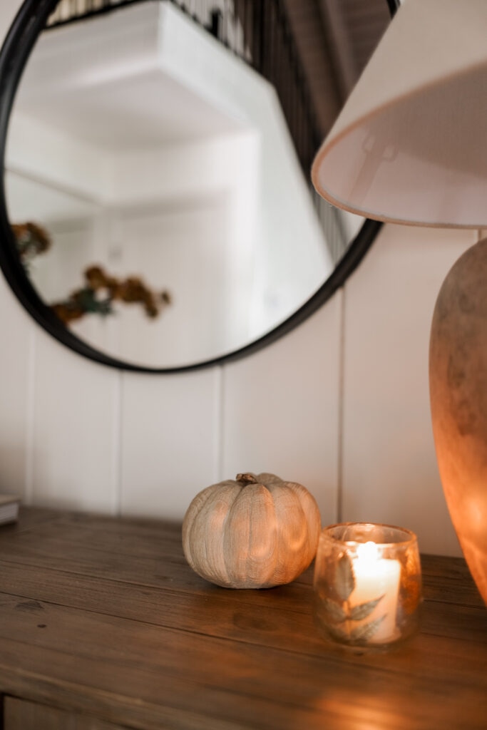When you walk into my home, I want it to instantly feel like fall. So, naturally, I added some fall stems in a vase by the entry table — they’re the perfect mix of earthy and autumnal. And you know I had to add a couple of candles for that warm, flickering glow. Nothing says “fall” like the smell of a pumpkin spice candle greeting you at the door.