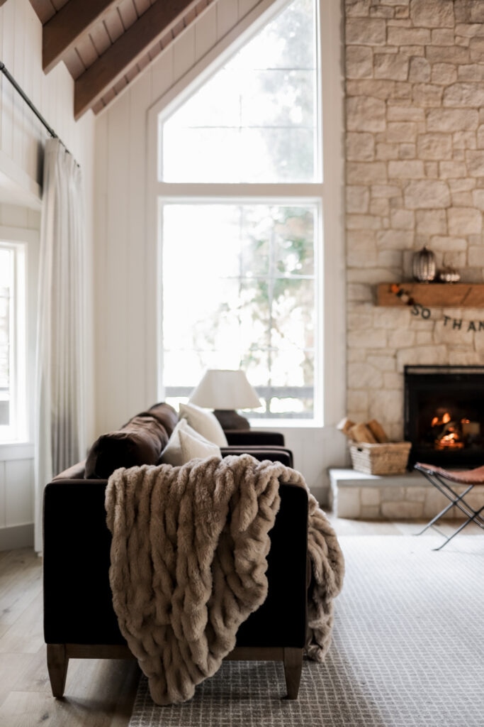 To make the living room even cozier, I tossed a faux fur throw over this chair — perfect for snuggling up with a good book or a fall movie marathon! It adds that soft, luxurious touch that practically begs you to settle in and stay awhile.