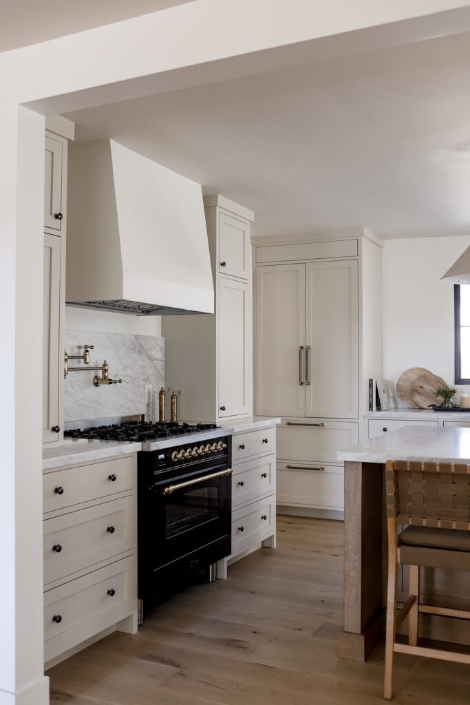 range | wood floors in ‘chambord’ | hardware | rug | pot filler | faucet | knobs | pulls | appliance pulls | pendant lights | counter stools | sink | wood boards | glass jars | brass salt & pepper mill | flameless candle | metal tray | dish towel | cook books | vase | olive stems