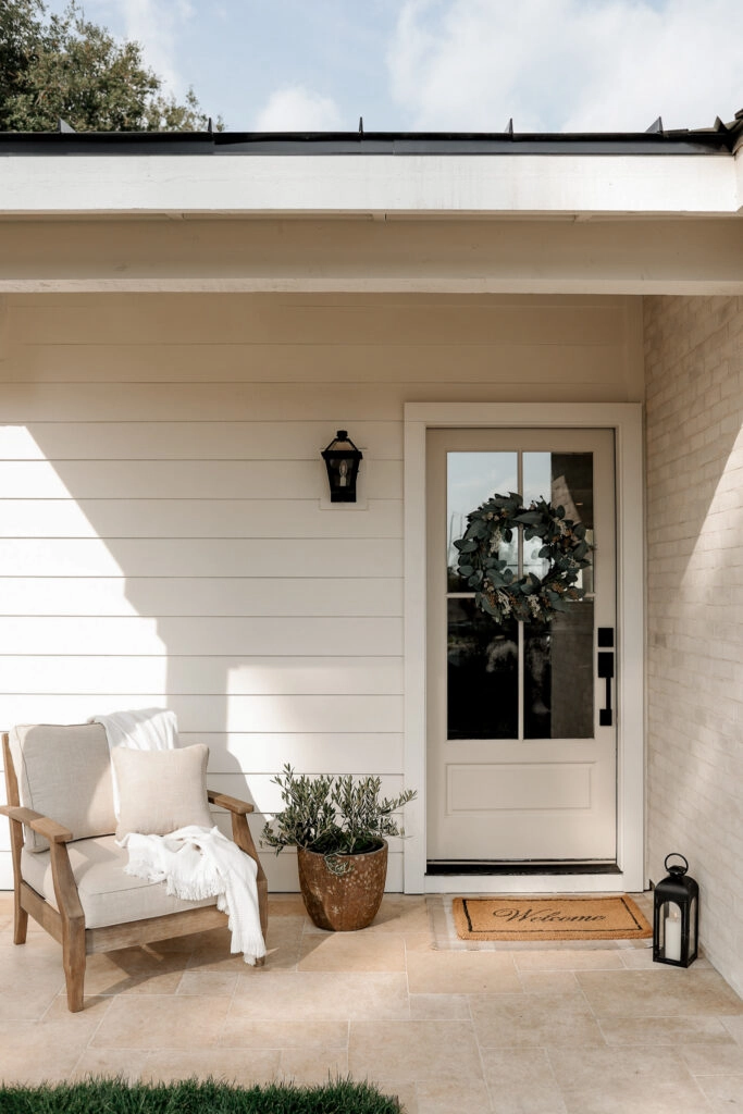I started with a Target wreath, which adds just the right amount of seasonal charm. To make the space feel cozy, I brought in an accent chair—perfect for enjoying a cup of coffee on a sunny morning. A potted olive plant adds greenery and texture, while a black lantern ties everything together with a touch of warmth and character.