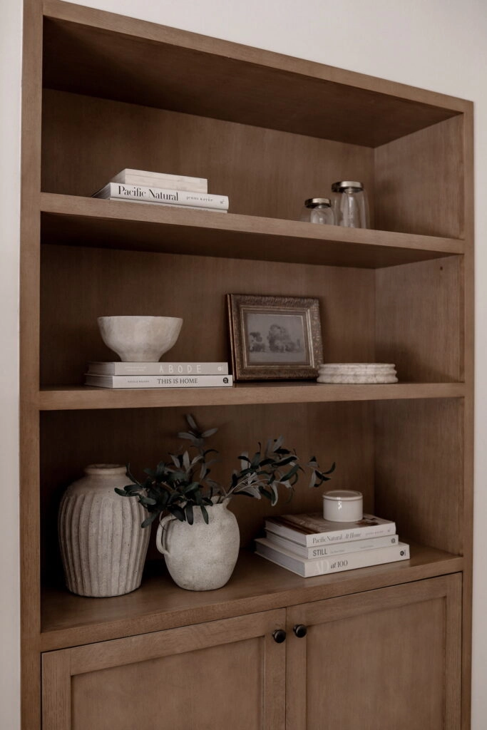 Shelf styling might seem like one of those finishing touches you can ignore… until your space feels just a little off and you can’t quite figure out why. If you’ve ever stared at a blank shelf wondering where to start, you’re not alone. Here are four tried-and-true tips I always use when styling shelves to make them feel balanced, personal, and cohesive: