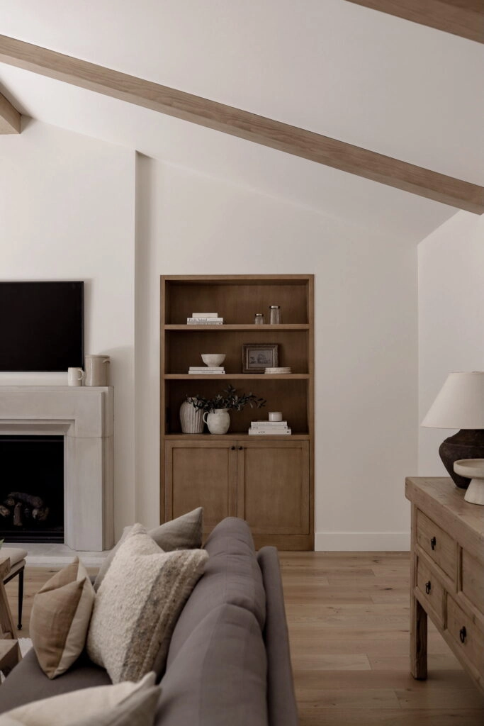 Cohesion is key. Echo similar materials, tones, or finishes across your shelves—think woven baskets, ceramic vases, or wood frames. When colors and textures are thoughtfully repeated, everything feels intentional (even if it came together over time).